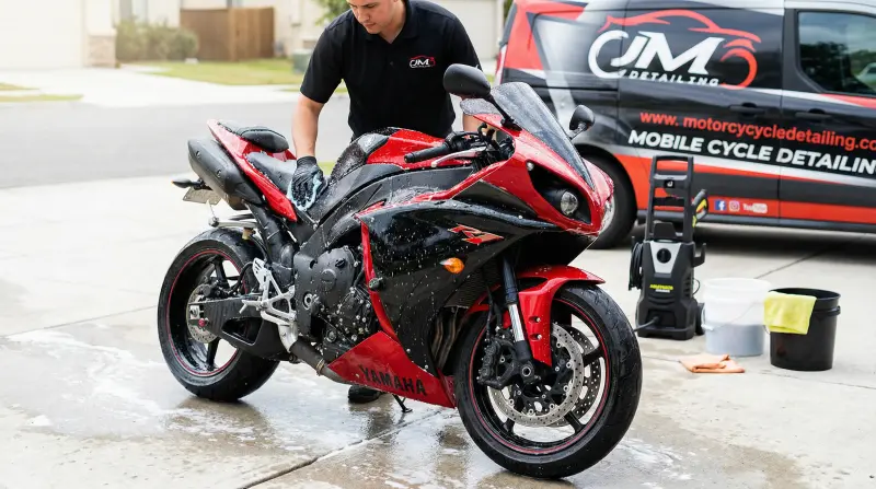 خدمة تنظيف وتلميع دراجات نارية متخصصة. غسيل خارجي كامل، صيانة السلسلة، تلميع الكروم، ومعالجات وقائية. نحضر المعدات الاحترافية إلى موقعك للعناية المتخصصة.